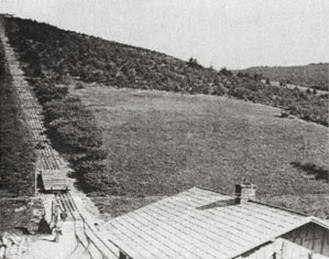 Am Ende der ca. 2,9 km langen Sattelstrecke (ein Abschnitt dieser ehemaligen Trasse ist heute übrigens ein Teil des Wanderweges zwischen dem Feistritzsattel und dem Sonnwendstein) wurden die Waggons über einen Bremsberg mit 974 m Länge ins ca. 240 m tiefer gelegene Fröschnitztal transportiert. |