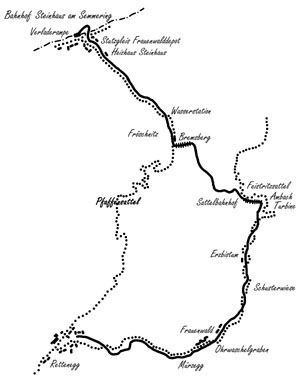 Von dort wurde das Holz talabwärts zum Bahnhof Steinhaus am Semmering befördert und verladen. Entlang der Waldbahn bestanden 15 Ladestellen. |